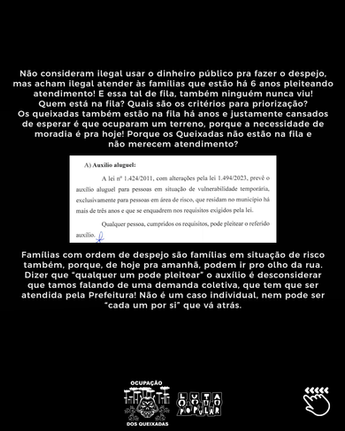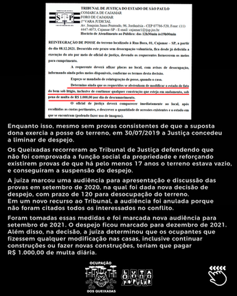 Acreditamos que as nossas necessidades só serão atendidas através da luta direta, e na nossa caminhada tem que ter muito respeito, sem racismo, nem machismo, nem qualquer tipo de preconceito ou opressão, que só fazem dividir o povo. Nossa união é nossa força contra os de cima! O que a gente quer é poder viver melhor, e a partir das nossas lutas em cada território, construir escolas de poder popular, pra que o povo cada vez mais ganhe a confiança em si mesmo e a certeza de que o mundo mudado que a gente precisa vai vir das nossas mãos!